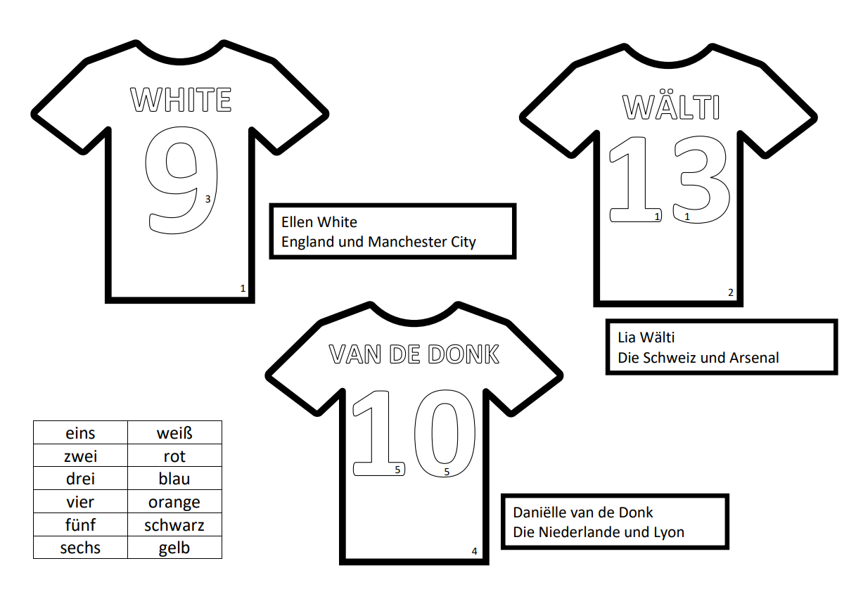 Get your pupils to colour in the teams’ kits using the German numbers and colours. It’s also a good way to help pupils learn the names of some of the players from different teams.